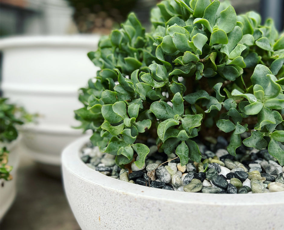 Building our collection of bespoke indoor/ outdoor pots and plants, we pride ourselves on attention to detail, hand-mixed customised organic soil, and use of premium pebbles.