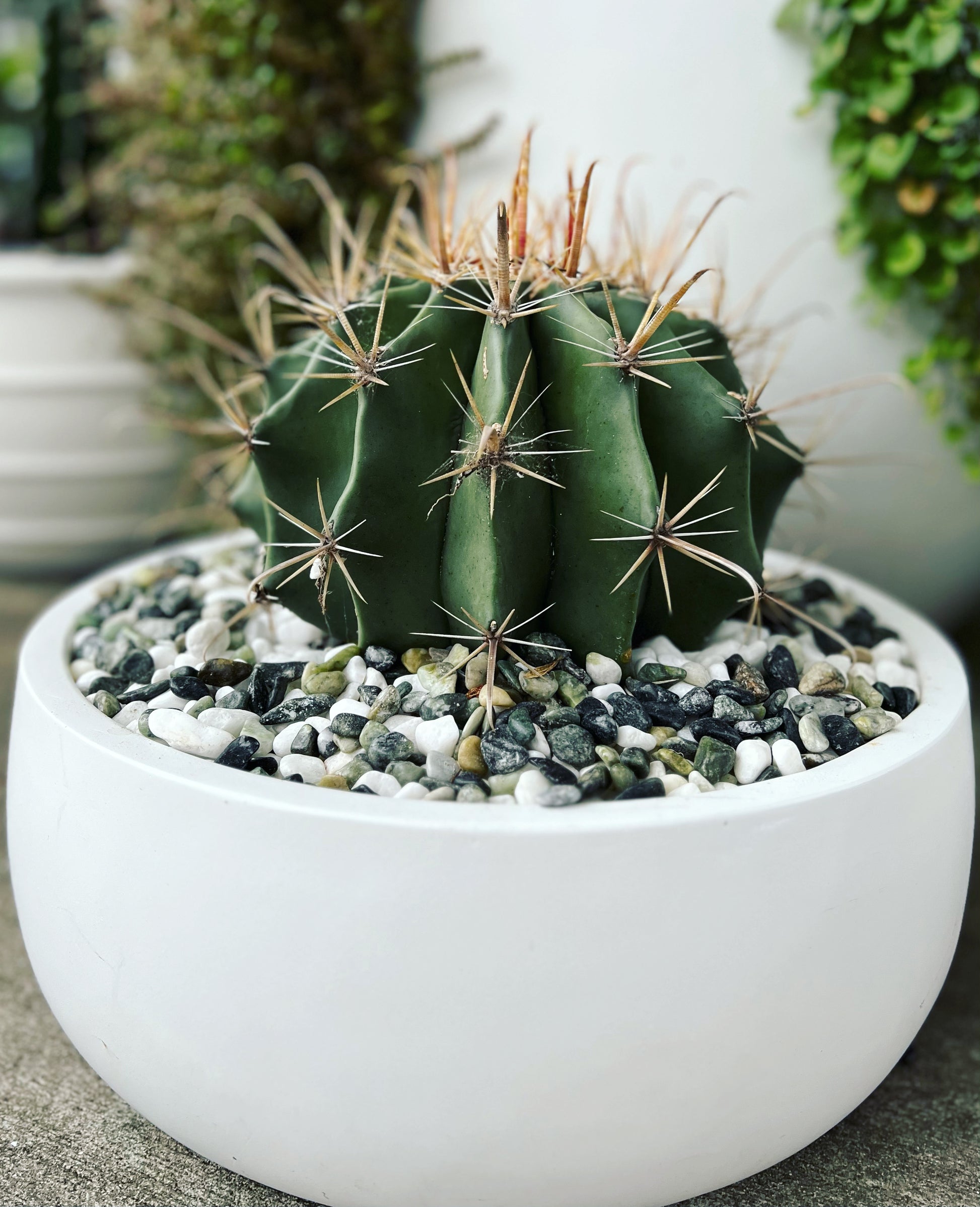 Potted Exotic Barrel Cactus in White Fibrestone Pot.