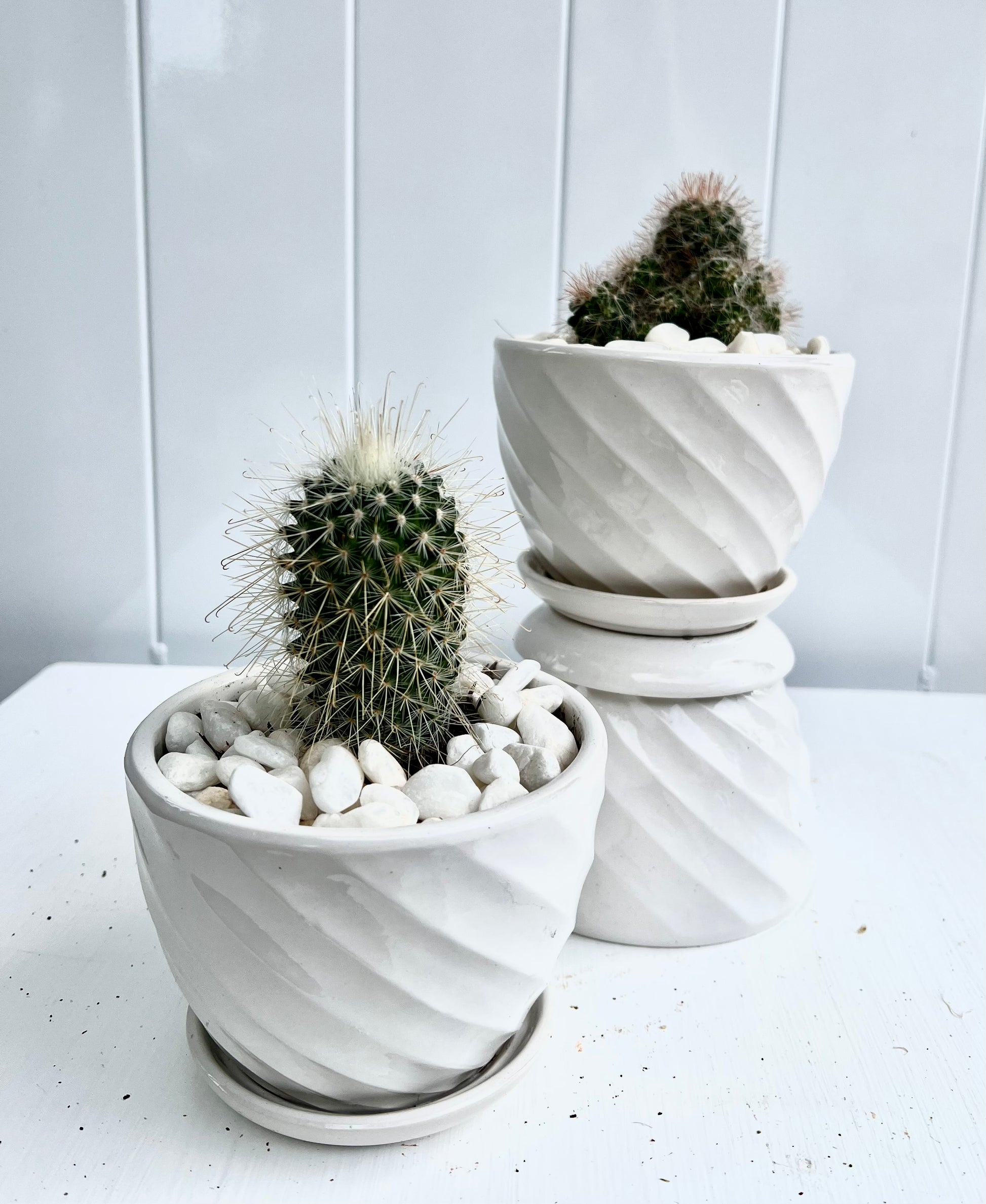 Seasonal Baby Cactus in Twisted White Ceramic Pot with Integrated Saucer